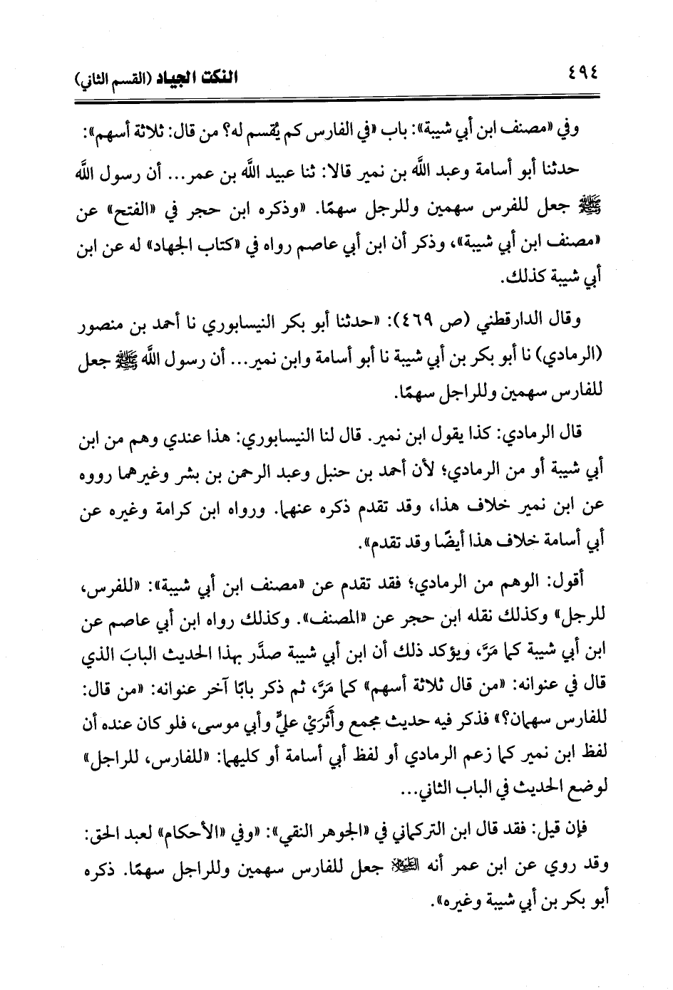 وقال الدارقطني (ص 469): "حدثنا أبو بكر النيسابوري نا أحمد بن منصور (الرمادي) نا أبو بكر بن أبي شيبة نا أبو أسامة وابن نمير ... أن رسول الله -صلى الله عليه وسلم- جعل للفارس سهمين وللراجل سهمًا.