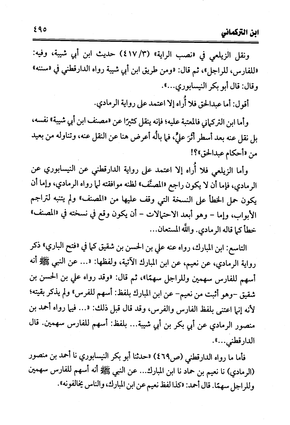فأما ما رواه الدارقطني (ص 469) "حدثنا أبو بكر النيسابوري نا أحمد بن منصور (الرمادي) نا نعيم بن حماد نا ابن المبارك ... عن النبي -صلى الله عليه وسلم- أنه أسهم للفارس سهمين وللراجل سهمًا. قال أحمد: "كذا لفظ نعيم عن ابن المبارك، والناس يخالفونه".
