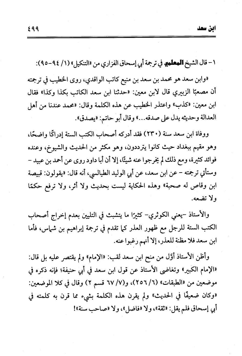 وأظن الأستاذ أوَّل من منح ابن سعد لقب: "الإمام" ولم يقتصر عليه بل قال: "الإمام الكبير" وتغاضى الأستاذ عن قول ابن سعد في أبي حنيفة؛ فإنه ذكره في موضعن من "الطبقات" (6/ 256)، و (7/ 67 قسم 2) وقال في كلا الموضعين: "وكان ضعيفًا في الحديث" ولم يقرن هذه الكلمة بشيء مما قرن به كلمته في أبي إسحاق فلم يقل: "ثقة"، ولا "فاضل"، ولا "صاحب سنة"!