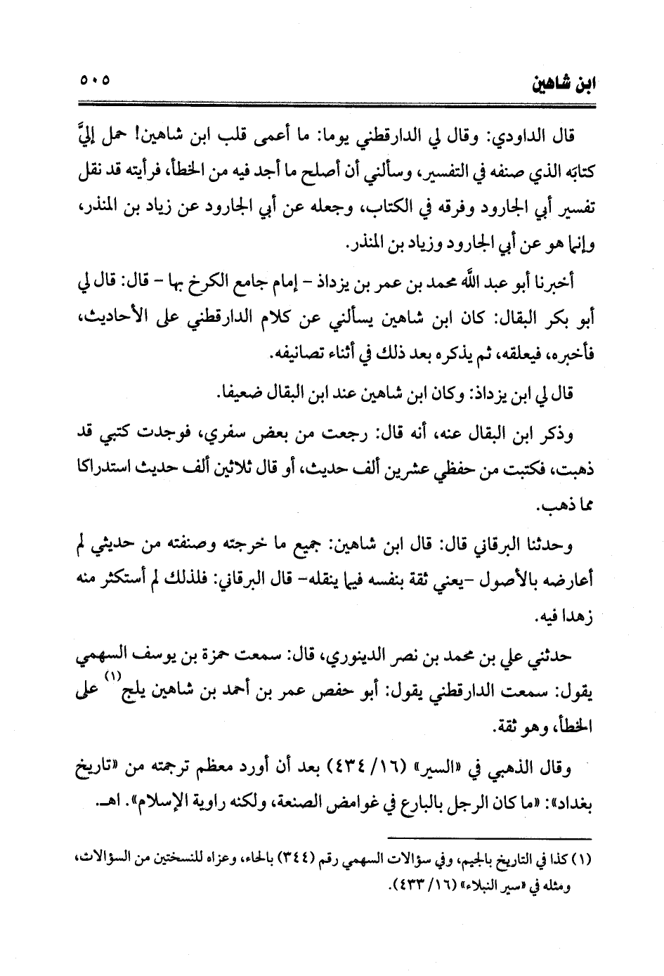 قال الداودي: وقال لي الدارقطني يومًا: ما أعمى قلب ابن شاهين! حمل إليَّ كتابَه الذي صنفه في التفسير، وسألني أن أصلح ما أجد فيه من الخطأ، فرأيته قد نفل تفسير أبي الجارود وفرقه في الكتاب، وجعله عن أبي الجارود عن زياد بن المنذر، وإنما هو عن أبي الجارود وزياد بن المنذر.