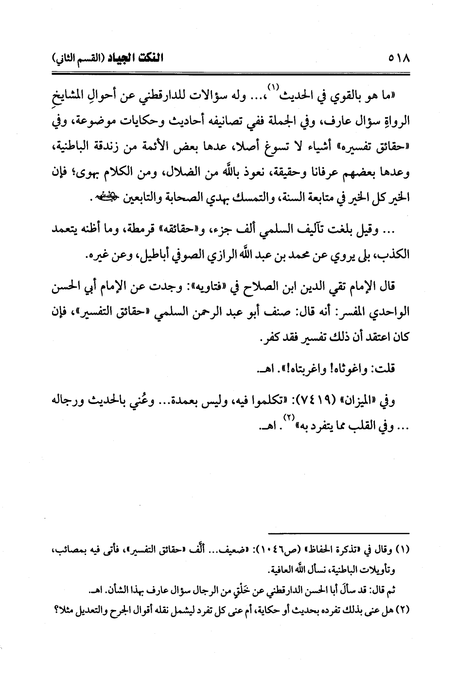 "ما هو بالقوي في الحديث (¬1)، ... وله سؤالات للدارقطني عن أحوالِ المشايخِ الرواةِ سؤال عارف، وفي الجملة ففي تصانيفه أحاديث وحكايات موضوعة، وفي "حقائق تفسيره" أشياء لا تسوغ أصلًا، عدها بعض الأئمة من زندقة الباطنية، وعدها بعضهم عرفانا وحقيقة، نعوذ بالله من الضلال، ومن الكلام بهوى؛ فإن الخير كل الخير في متابعة السنة، والتمسك بهدي الصحابة والتابعين -رضي الله عنهم-.