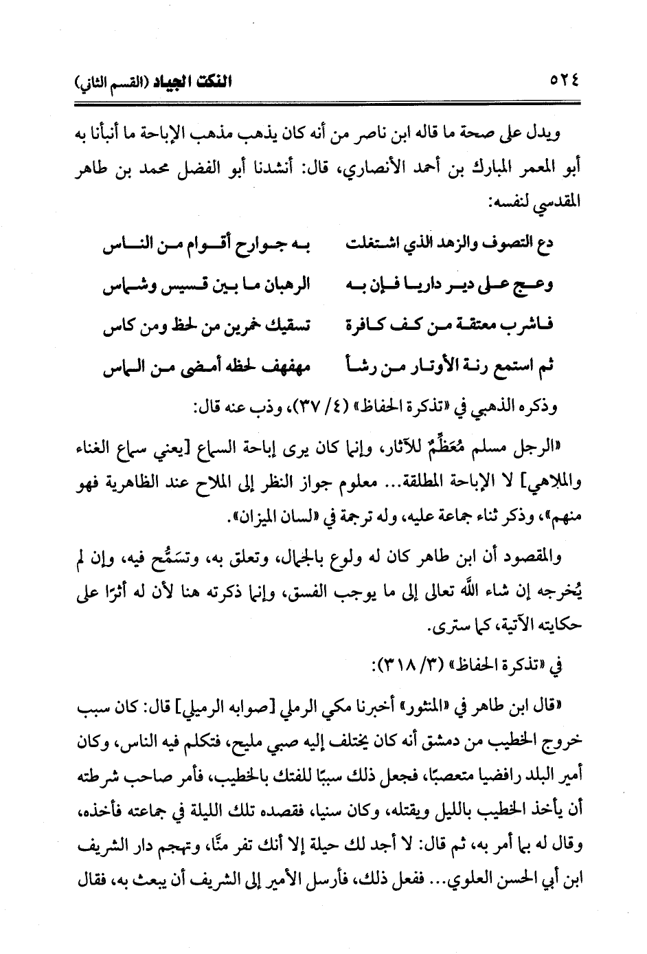 ويدل على صحة ما قاله ابن ناصر من أنه كان يذهب مذهب الإباحة ما أنبأنا به أبو المعمر المبارك بن أحمد الأنصاري، قال: أنشدنا أبو الفضل محمد بن طاهر المقدسي لنفسه: