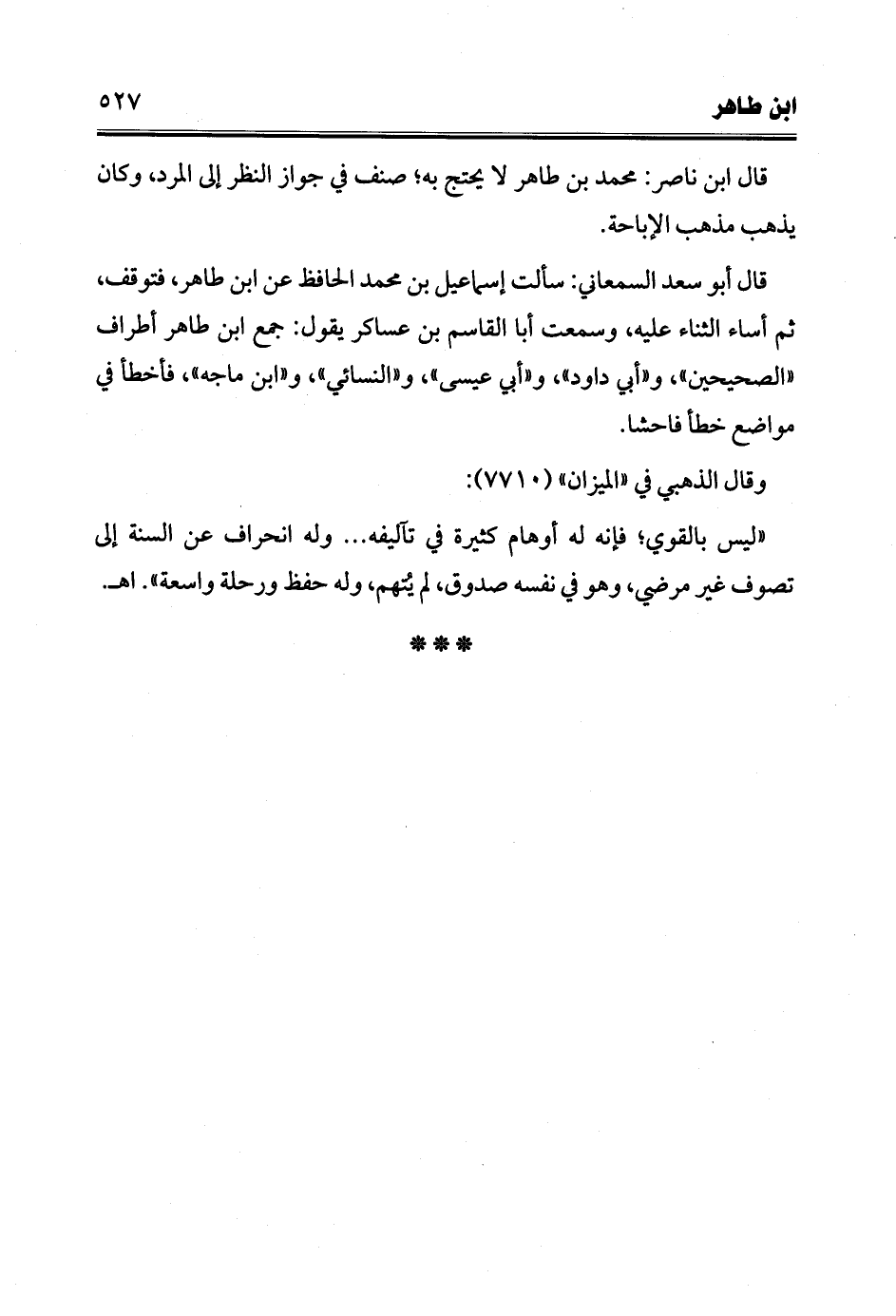 قال ابن ناصر: محمد بن طاهر لا يحتج به؛ صنف في جواز النظر إلى المرد، وكان يذهب مذهب الإباحة.