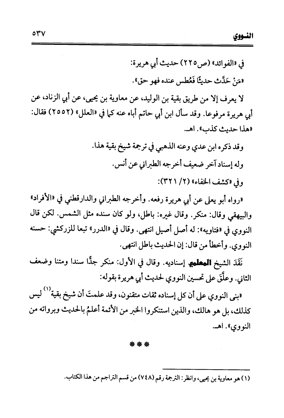 "بنى النووي على أن كل إسناده ثقات متقنون، وقد علمتَ أن شيخ بقية (¬1) ليس كذلك، بل هو هالك، والذين استنكروا الخبر من الأئمة أعلمُ بالحديث وبرواته من النووي". اهـ.