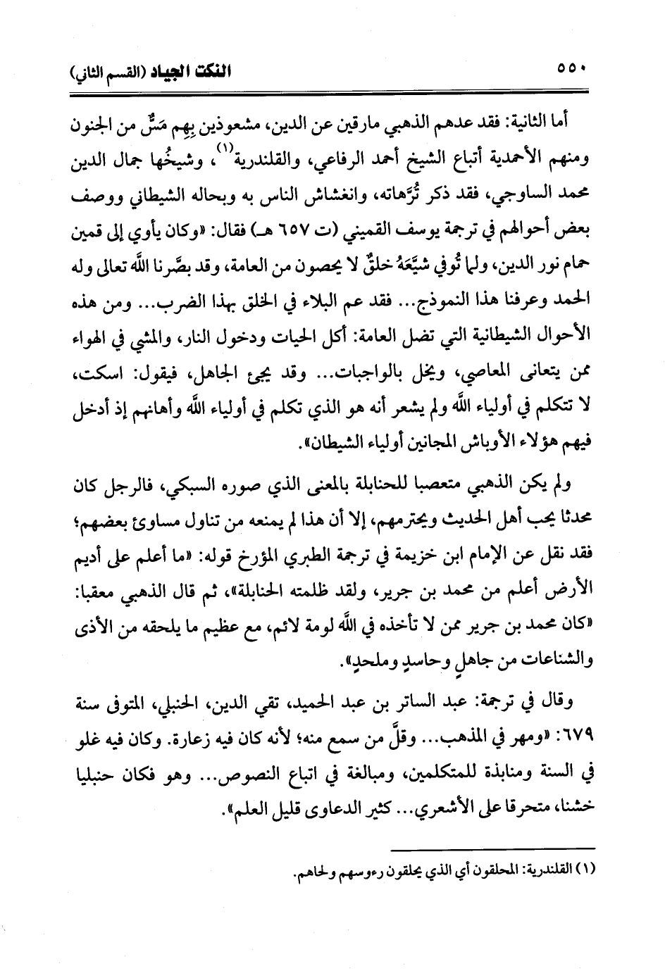 أما الثانية: فقد عدهم الذهبي مارقين عن الدين، مشعوذين بِهِم مَسٌّ من الجنون ومنهم الأحمدية أتباع الشيخ أحمد الرفاعي، والقلندرية (¬1)، وشيخُها جمال الدين محمد الساوجي، فقد ذكر تُرَّهاته، وانغشاش الناس به وبحاله الشيطاني ووصف بعض أحوالهم في ترجمة يوسف القميني (ت 657 هـ) فقال: "وكان يأوي إلى قمين حمام نور الدين، ولما تُوفي شيَّعَهُ خلقٌ لا يحصون من العامة، وقد بصَّرنا الله تعالى وله الحمد وعرفنا هذا النموذج ... فقد عم البلاء في الخلق بهذا الضرب ... ومن هذه الأحوال الشيطانية التي تضل العامة: أكل الحيات ودخول النار، والمشي في الهواء ممن يتعانى المعاصي، ويخل بالواجبات ... وقد يجىء الجاهل، فيقول: اسكت، لا تتكلم في أولياء الله ولم يشعر أنه هو الذي تكلم في أولياء الله وأهانهم إذ أدخل فيهم هؤلاء الأوباش المجانين أولياء الشيطان".