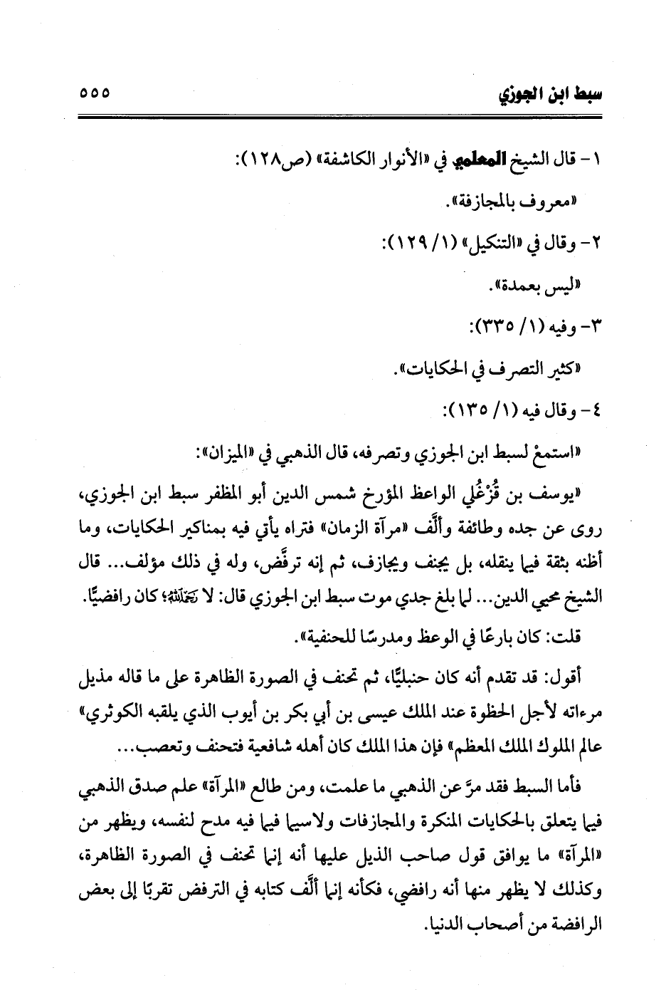 فأما السبط فقد مرَّ عن الذهبي ما علمت، ومن طالع "المرآة" علم صدق الذهبي فيما يتعلق بالحكايات المنكرة والمجازفات ولا سيما فيما فيه مدح لنفسه، ويظهر من "المرآة" ما يوافق قول صاحب الذيل عليها أنه إنما تحنف في الصورة الظاهرة، وكذلك لا يظهر منها أنه رافضي، فكأنه إنما أَلَّف كتابه في الترفض تقربًا إلى بعض الرافضة من أصحاب الدنيا.