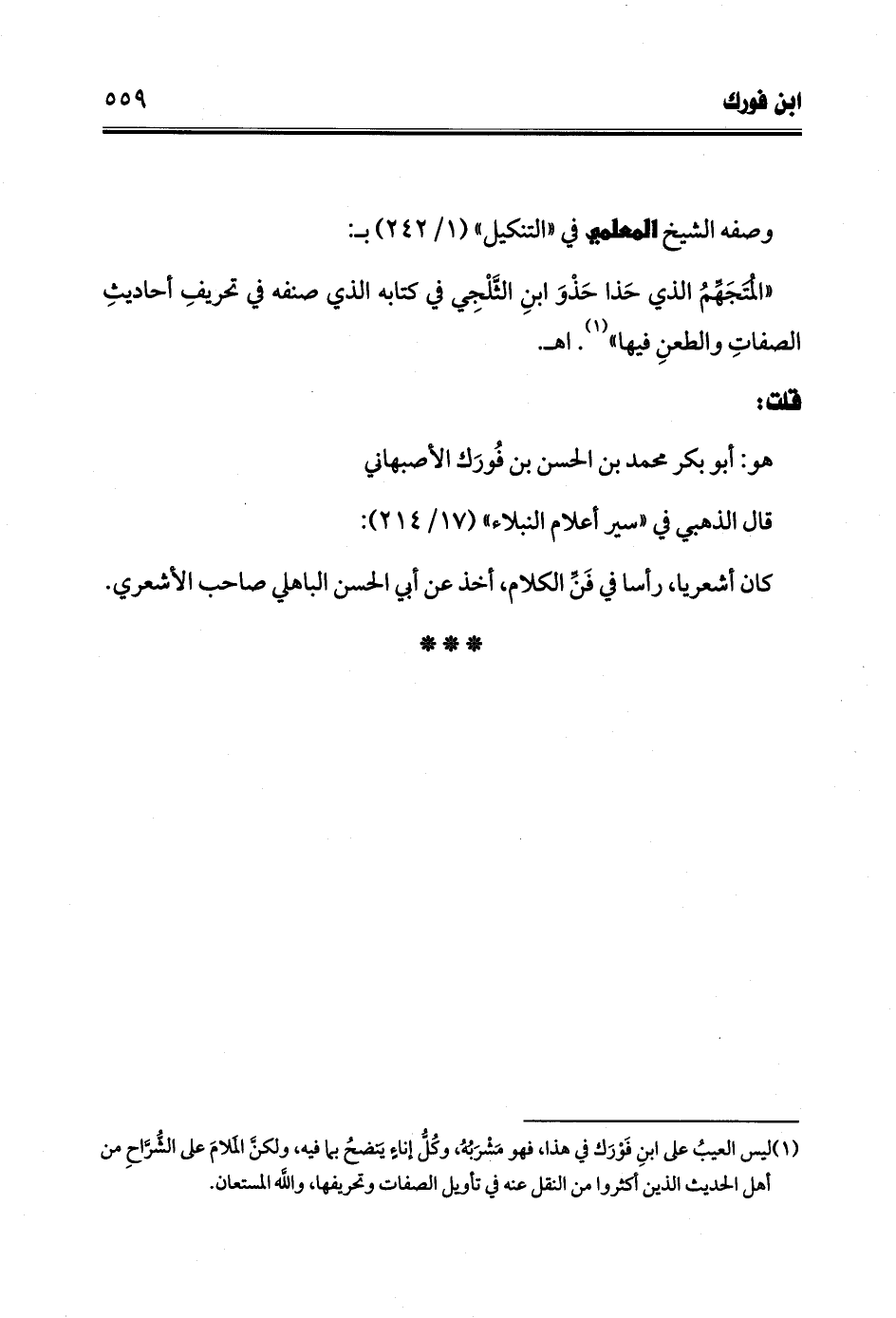 (¬1) ليس العيبُ على ابنِ فَوْرَك في هذا، فهو مَشْرَبُهُ، وكُلُّ إناءٍ يَنضحُ بما فيه، ولكنَّ المَلامَ على الشُرَّاحِ من أهل الحديث الذين أكثروا من النقل عنه في تأويل الصفات وتحريفها، والله المستعان.