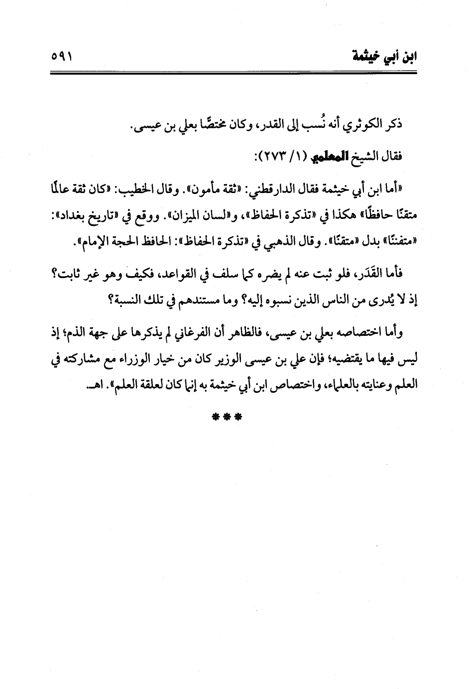 وأما اختصاصه بعلي بن عيسى، فالظاهر أن الفرغاني لم يذكرها على جهة الذم؛ إذ ليس فيها ما يقتضيه؛ فإن علي بن عيسى الوزير كان من خيار الوزراء مع مشاركته في العلم وعنايته بالعلماء واختصاص ابن أبي خيثمة به إنما كان لعلقة العلم". اهـ.