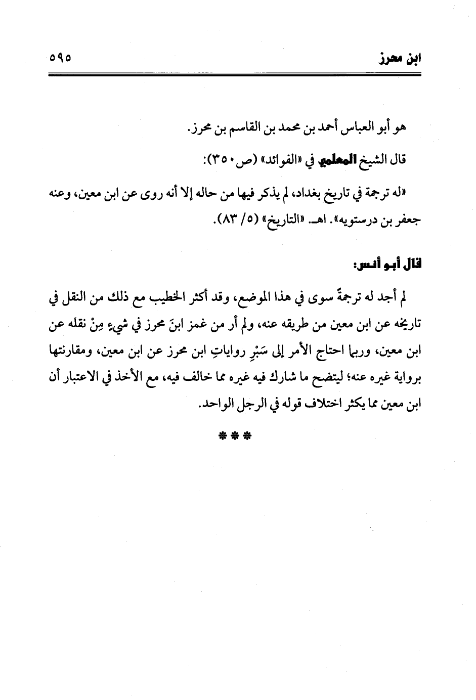 لم أجد له ترجمةً سوى في هذا الموضع، وقد أكثر الخطيب مع ذلك من النقل في تاريخه عن ابن معين من طريقه عنه، ولم أر من غمز ابنَ محرز في شيءٍ مِنْ نقله عن ابن معين، وربما احتاج الأمر إلى سَبْرِ رواياتِ ابن محرز عن ابن معين، ومقارنتها برواية غيره عنه؛ ليتضح ما شارك فيه غيره مما خالف فيه، مع الأخذ في الاعتبار أن ابن معين مما يكثر اختلاف قوله في الرجل الواحد.