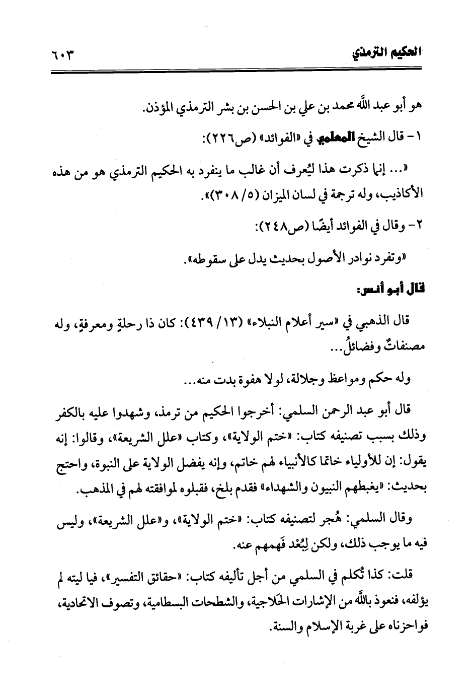 وقال السلمي: هُجر لتصنيفه كتاب: "ختم الولاية"، و"علل الشريعة"، وليس فيه ما يوجب ذلك، ولكن لِبُعد فَهمهم عنه.
