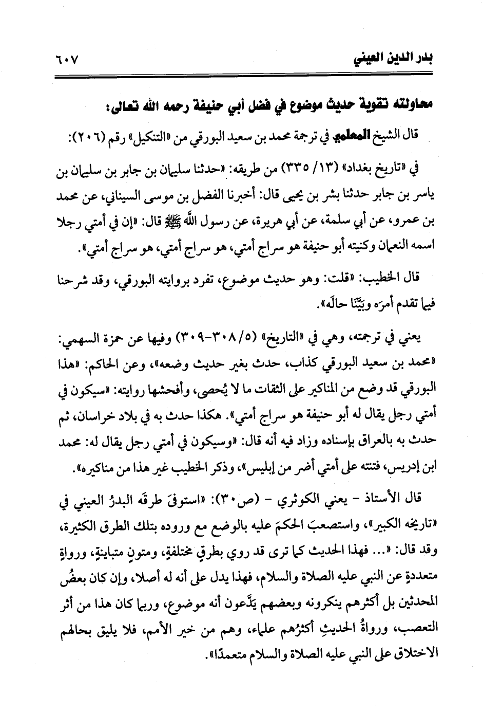 قال الأستاذ -يعني الكوثري- (ص 30): "استوفى طرقَه البدرُ العيني في "تاريخه الكبير"، واستصعبَ الحكمَ عليه بالوضع مع وروده بتلك الطرق الكثيرة، وقد قال: " ... فهذا الحديث كما ترى قد روي بطرقٍ مختلفةٍ ومتونٍ متباينةٍ، ورواةٍ متعددةٍ عن النبي عليه الصلاة والسلام، فهذا يدل على أنه له أصلا، وإن كان بعضُ المحدثين بل أكثرهم ينكرونه وبعضهم يَدَّعون أنه موضوع، وربما كان هذا من أثر التعصب، ورواةُ الحديثِ أكثرُهم علماء، وهم من خير الأمم، فلا يليق بحالهم الاختلاق على النبي عليه الصلاة والسلام متعمدًا".
