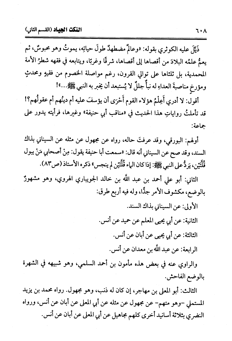 أولهم: البورقي، وقد عرفتَ حاله، رواه عن مجهول عن مثله عن السيناني بذاك السند، وقد صح عن السيناني أنه قال: "سمعت أبا حنيفة يقول: مِنْ أصحابي مَنْ يبول قُلَّتَيْن، يَردُّ على النبي -صلى الله عليه وسلم-: إذا كان الماء قُلَّتَيْن لم ينجس" ذكره الأستاذ (ص 83).