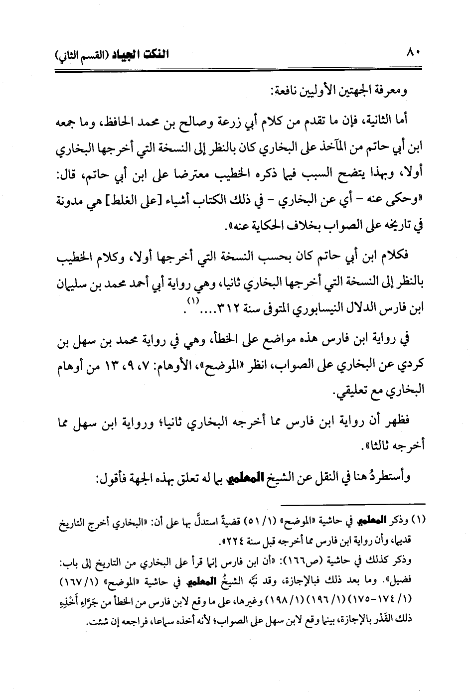 فكلام ابن أبي حاتم كان بحسب النسخة التي أخرجها أولا، وكلام الخطيب بالنظر إلى النسخة التي أخرجها البخاري ثانيا، وهي رواية أبي أحمد محمد بن سليمان ابن فارس الدلال النيسابوري المتوفى سنة 312 ... (¬1).