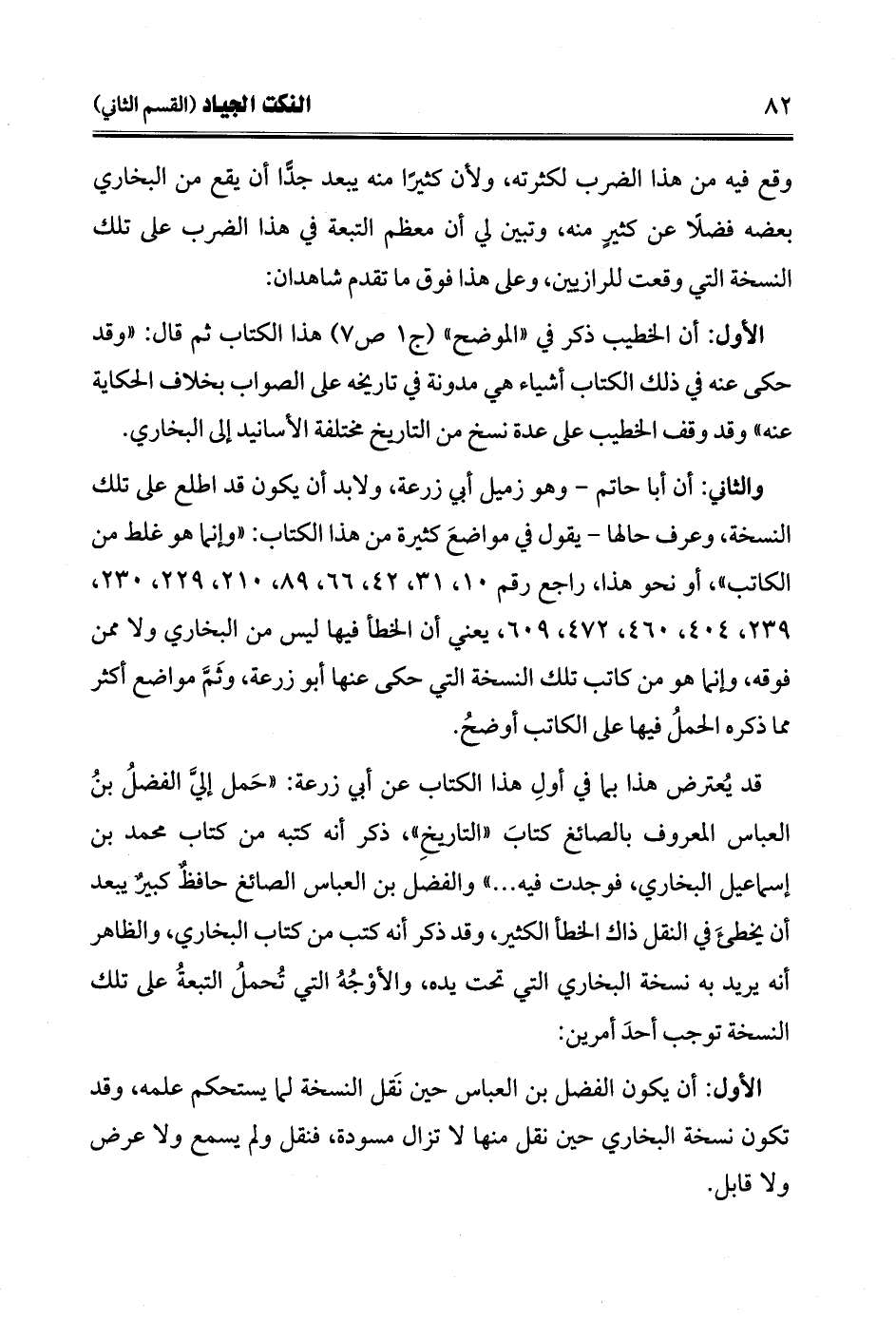 قد يُعترض هذا بما في أولِ هذا الكتاب عن أبي زرعة: "حَمل إليَّ الفضلُ بنُ العباس المعروف بالصائغ كتابَ "التاريخِ"، ذكر أنه كتبه من كتاب محمد بن إسماعيل البخاري، فوجدت فيه ... " والفضل بن العباس الصائغ حافظٌ كبيرٌ يبعد أن يخطىءَ في النقل ذاك الخطأ الكثير، وقد ذكر أنه كتب من كتاب البخاري، والظاهر أنه يريد به نسخة البخاري التي تحت يده والأوْجُهُ التي تُحملُ التبعةُ على تلك النسخة توجب أحدَ أمرين: