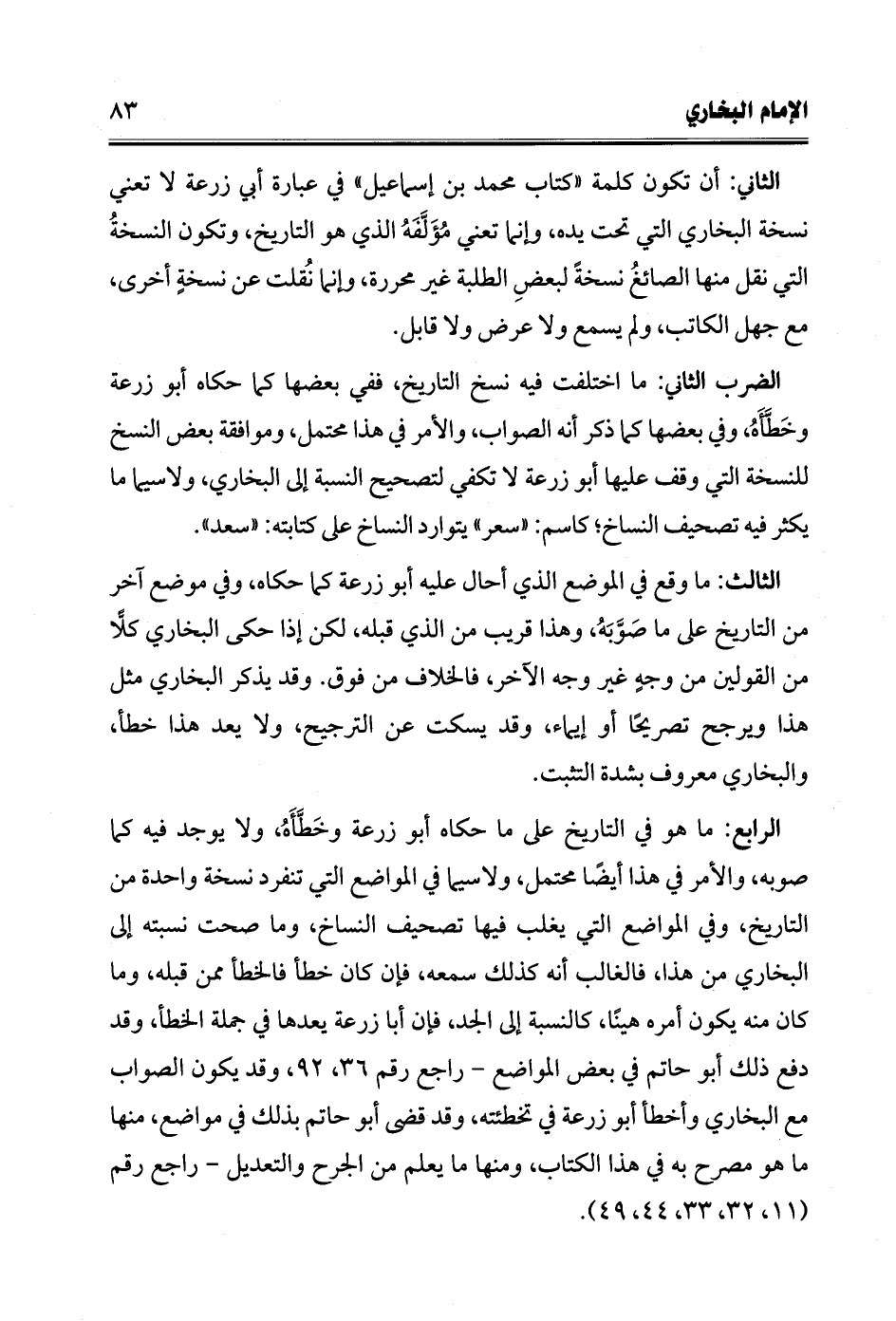 الضرب الثاني: ما اختلفت فيه نسخ التاريخ، ففي بعضها كما حكاه أبو زرعة وخَطَّأَهُ، وفي بعضها كما ذكر أنه الصواب، والأمر في هذا محتمل، وموافقة بعض النسخ للنسخة التي وقف عليها أبو زرعة لا تكفي لتصحيح النسبة إلى البخاري، ولاسيما ما يكثر فيه تصحيف النساخ؛ كاسم: "سعر" يتوارد النساخ على كتابته: "سعد".