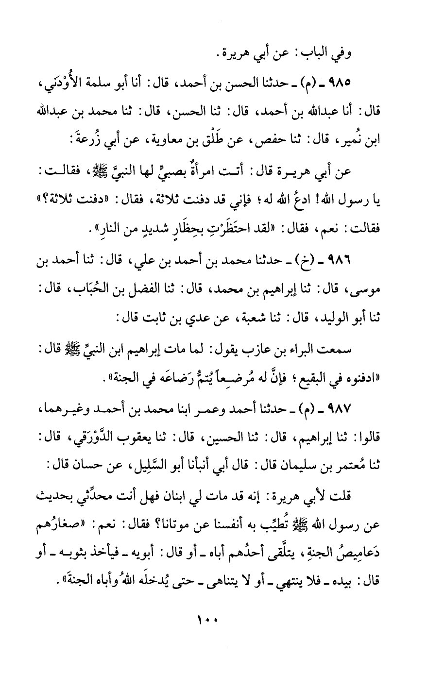 987 - (م) - حدثنا أحمد وعمر ابنا محمد بن أحمد وغيرهما، قالوا: ثنا إبراهيم، قال: ثنا الحسين، قال: ثنا يعقوب الدورقي، قال: ثنا معتمر بن سليمان قال: قال أبي أنبأنا أبو السليل، عن حسان قال: