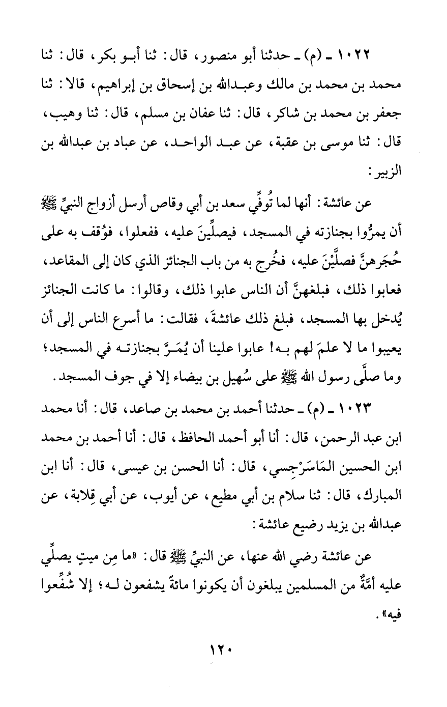 1023 - (م) - حدثنا أحمد بن محمد بن صاعد، قال: أنا محمد بن عبد الرحمن، قال: أنا أبو أحمد الحافظ، قال: أنا أحمد بن محمد بن الحسين الماسرجسي، قال: أنا الحسن بن عيسى، قال: أنا ابن المبارك، قال: ثنا سلام بن أبي مطيع، عن أيوب، عن أبي قلابة، عن عبد الله بن يزيد رضيع عائشة: