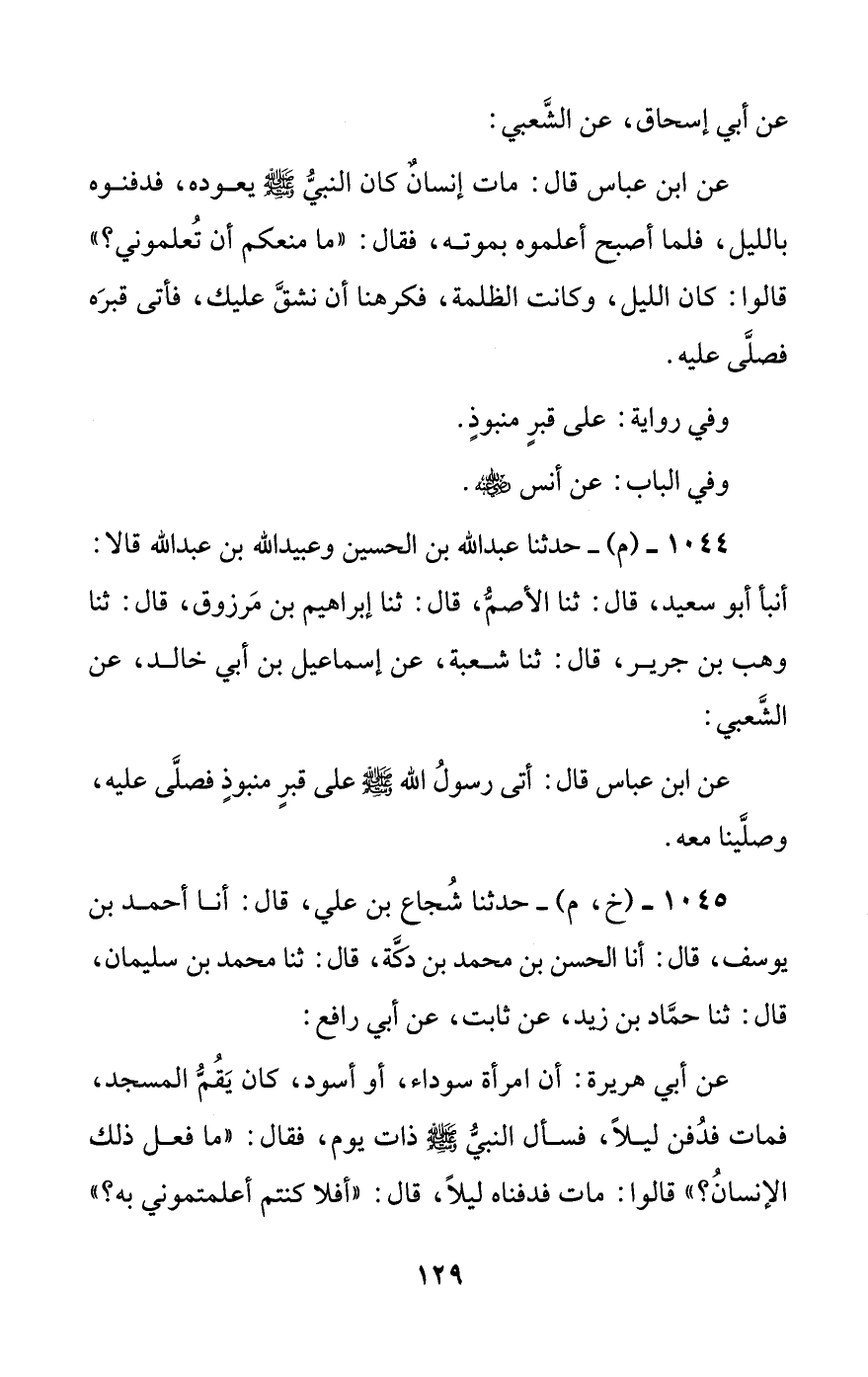 عن أبي هريرة: أن امرأة سوداء، أو أسود، كان يقم المسجد، فمات فدفن ليلا، فسأل النبي صلى الله عليه وسلم ذات يوم، فقال: ((ما فعل ذلك الإنسان؟)) قالوا: مات فدفناه ليلا، قال: ((أفلا كنتم أعلمتموني به؟)) #130# فدلوه على قبره، فأتى قبره فصلى عليه، ثم قال: ((إن هذه القبور مملوءة ظلمة على أهلها، وإن الله تعالى منور عليهم فيها بصلاتي عليهم)).