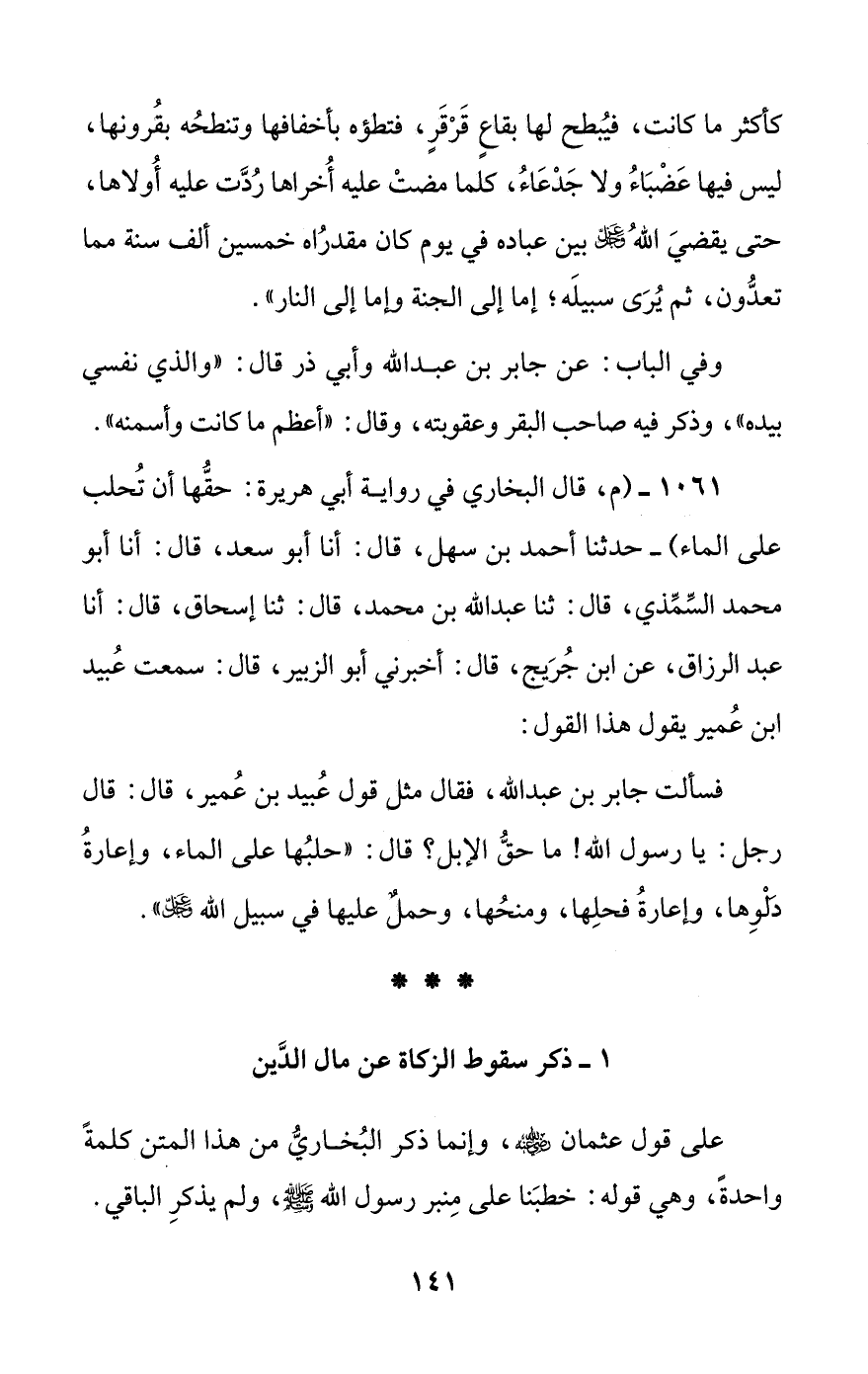 فسألت جابر بن عبد الله، فقال مثل قول عبيد بن عمير، قال: قال رجل: يا رسول الله! ما حق الإبل؟ قال: ((حلبها على الماء، وإعارة دلوها، وإعارة فحلها، ومنحها، وحمل عليها في سبيل الله عز وجل)).