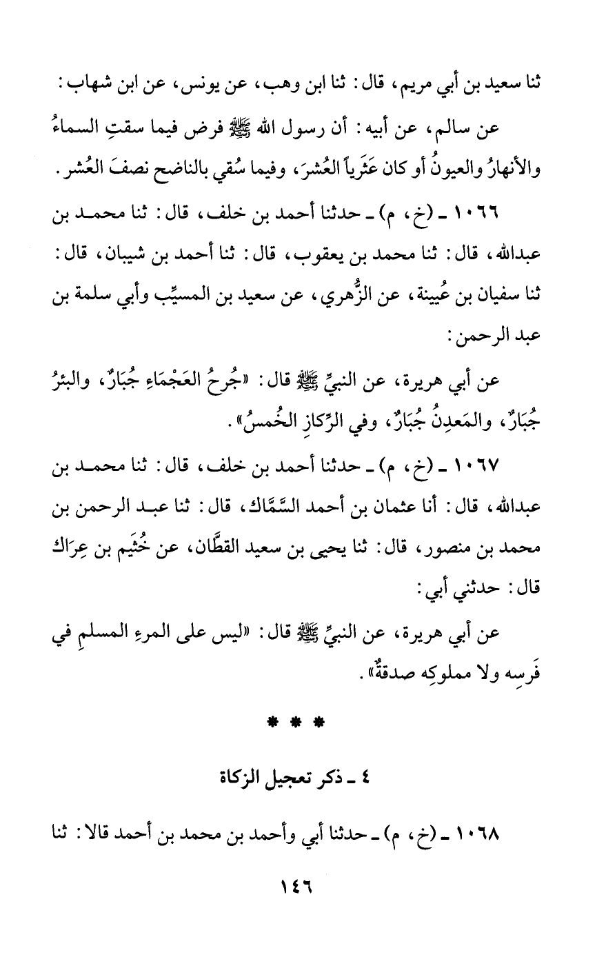 1066 - (خ، م) - حدثنا أحمد بن خلف، قال: ثنا محمد بن عبد الله، قال: ثنا محمد بن يعقوب، قال: ثنا أحمد بن شيبان، قال: ثنا سفيان بن عيينة، عن الزهري، عن سعيد بن المسيب وأبي سلمة بن عبد الرحمن: