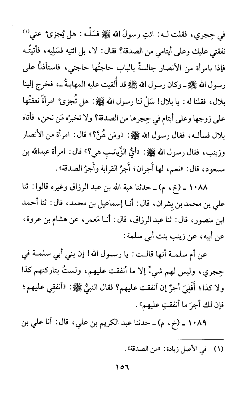 1088 - (خ، م) - حدثنا هبة الله بن عبد الرزاق وغيره قالوا: ثنا علي بن محمد بن بشران، قال: أنا إسماعيل بن محمد، قال: ثنا أحمد بن منصور، قال: ثنا عبد الرزاق، قال: أنا معمر، عن هشام بن عروة، عن أبيه، عن زينب بنت أبي سلمة: