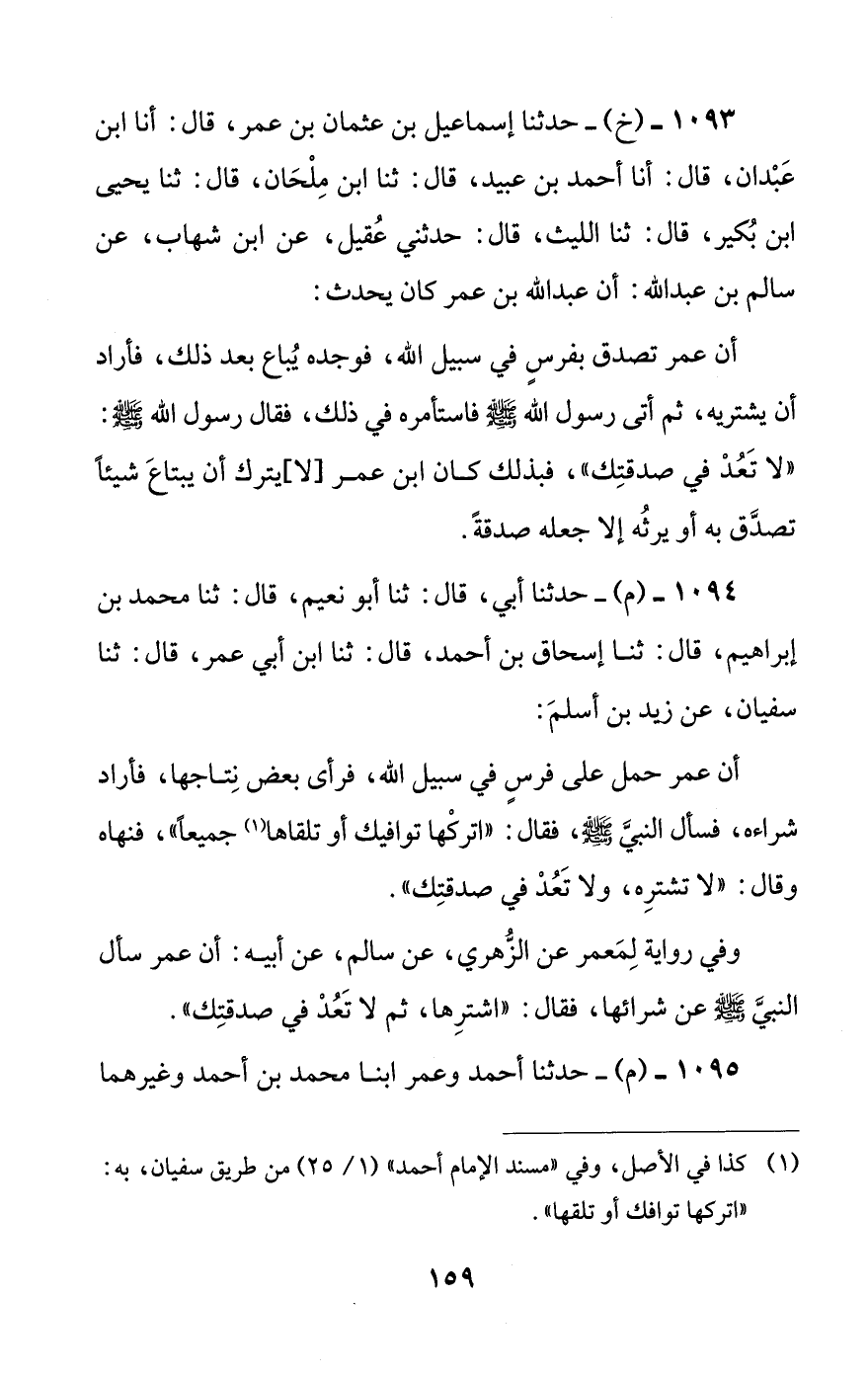 أن عمر تصدق بفرس في سبيل الله، فوجده يباع بعد ذلك، فأراد أن يشتريه، ثم أتى رسول الله صلى الله عليه وسلم فاستأمره في ذلك، فقال رسول الله صلى الله عليه وسلم: ((لا تعد في صدقتك))، فبذلك كان ابن عمر [لا] يترك أن يبتاع شيئا تصدق به أو يرثه إلا جعله صدقة.