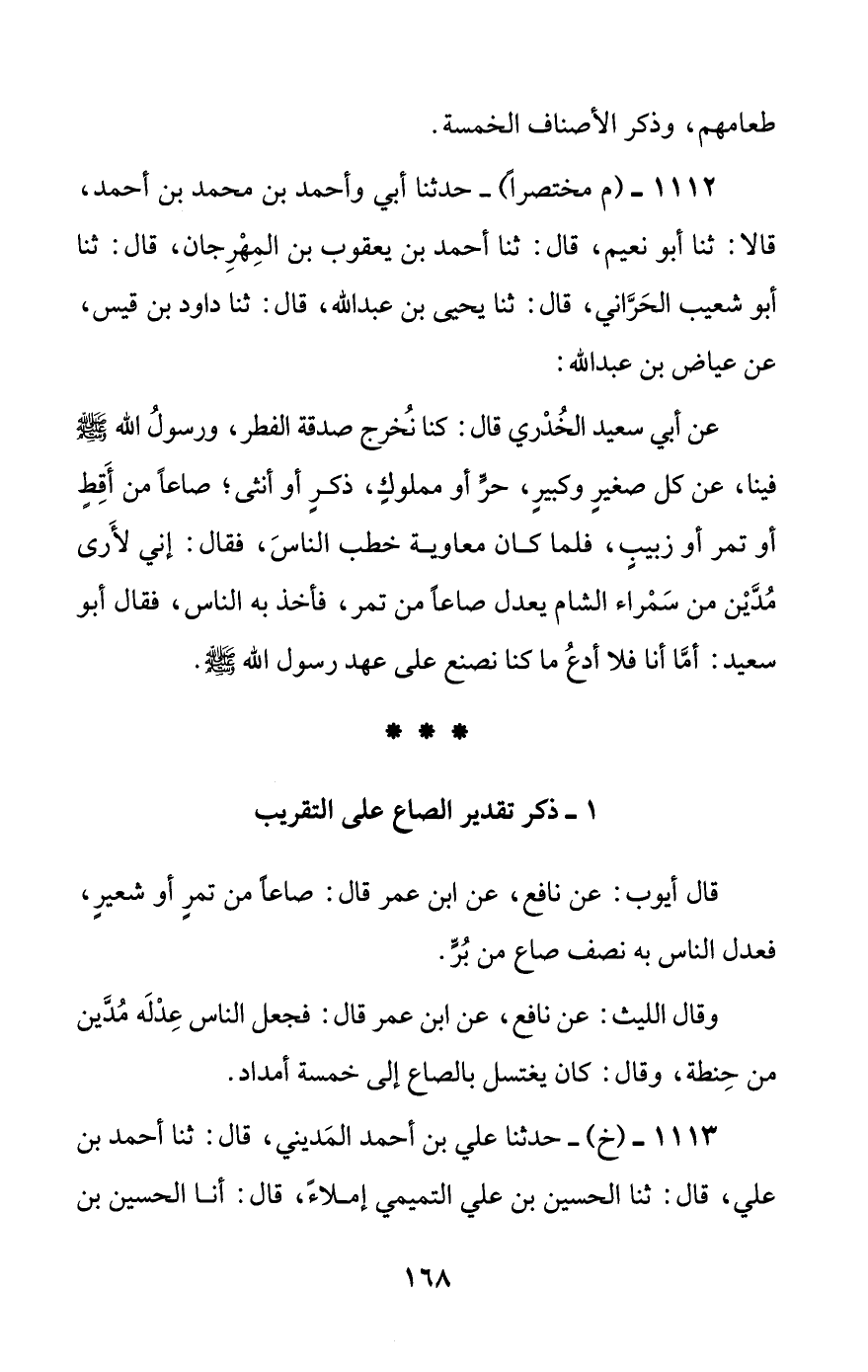 عن أبي سعيد الخدري قال: كنا نخرج صدقة الفطر، ورسول الله صلى الله عليه وسلم فينا، عن كل صغير وكبير، حر أو مملوك، ذكر أو أنثى؛ صاعا من أقط أو تمر أو زبيب، فلما كان معاوية خطب الناس، فقال: إني لأرى مدين من سمراء الشام يعدل صاعا من تمر، فأخذ به الناس، فقال أبو سعيد: أما أنا فلا أدع ما كنا نصنع على عهد رسول الله صلى الله عليه وسلم.