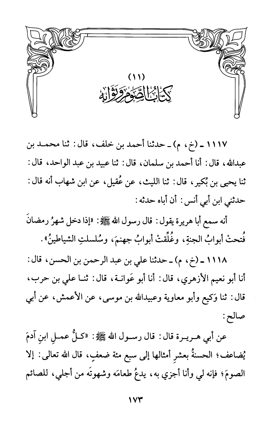 1117 - (خ، م) - حدثنا أحمد بن خلف، قال: ثنا محمد بن عبد الله، قال: أنا أحمد بن سلمان، قال: ثنا عبيد بن عبد الواحد، قال: ثنا يحيى بن بكير، قال: ثنا الليث، عن عقيل، عن ابن شهاب أنه قال: حدثني ابن أبي أنس: أن أباه حدثه:
