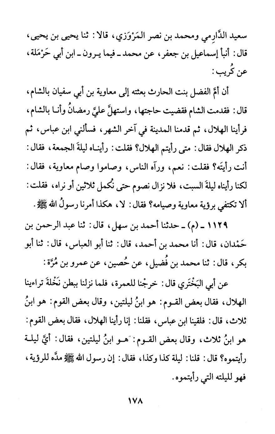 عن أبي البختري قال: خرجنا للعمرة، فلما نزلنا ببطن نخلة تراءينا الهلال، فقال بعض القوم: هو ابن ليلتين، وقال بعض القوم: هو ابن ثلاث، قال: فلقينا ابن عباس، فقلنا: إنا رأينا الهلال، فقال بعض القوم: هو ابن ثلاث، وقال بعض القوم: هو ابن ليلتين، فقال: أي ليلة رأيتموه؟ قال: قلنا: ليلة كذا وكذا، فقال: إن رسول الله صلى الله عليه وسلم مده للرؤية، فهو لليلته التي رأيتموه.