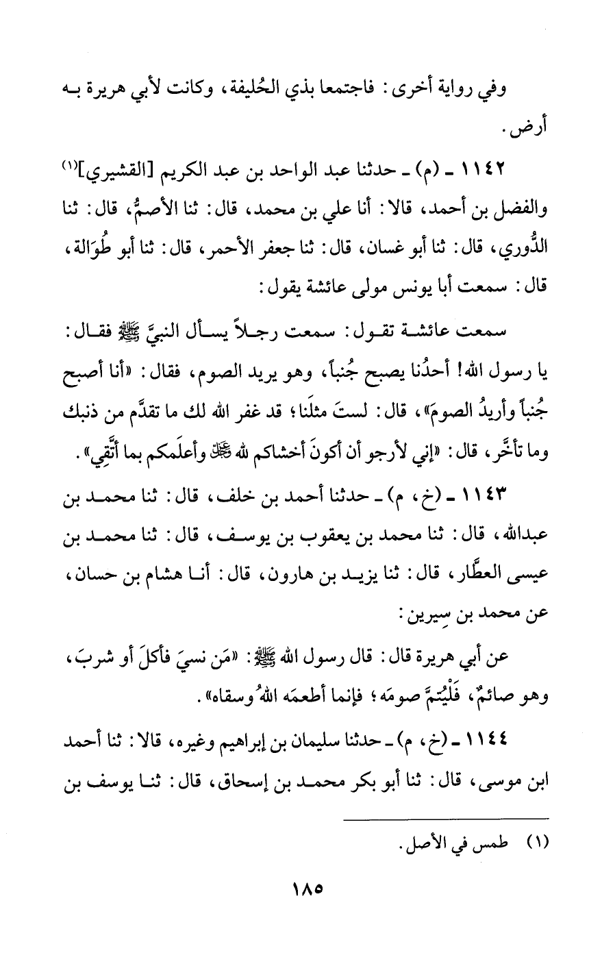 1143 - (خ، م) - حدثنا أحمد بن خلف، قال: ثنا محمد بن عبد الله، قال: ثنا محمد بن يعقوب بن يوسف، قال: ثنا محمد بن عيسى العطار، قال: ثنا يزيد بن هارون، قال: أنا هشام بن حسان، عن محمد بن سيرين: