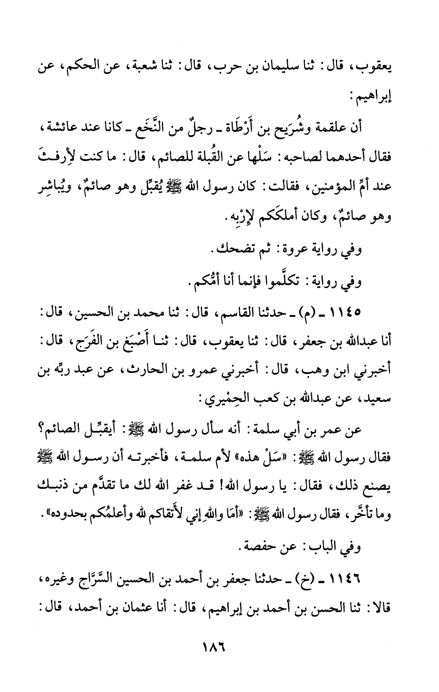 عن عمر بن أبي سلمة: أنه سأل رسول الله صلى الله عليه وسلم: أيقبل الصائم؟ فقال رسول الله صلى الله عليه وسلم: ((سل هذه)) لأم سلمة، فأخبرته أن رسول الله صلى الله عليه وسلم يصنع ذلك، فقال: يا رسول الله! قد غفر الله لك ما تقدم من ذنبك وما تأخر، فقال رسول الله صلى الله عليه وسلم: ((أما والله إني لأتقاكم لله وأعلمكم بحدوده)).