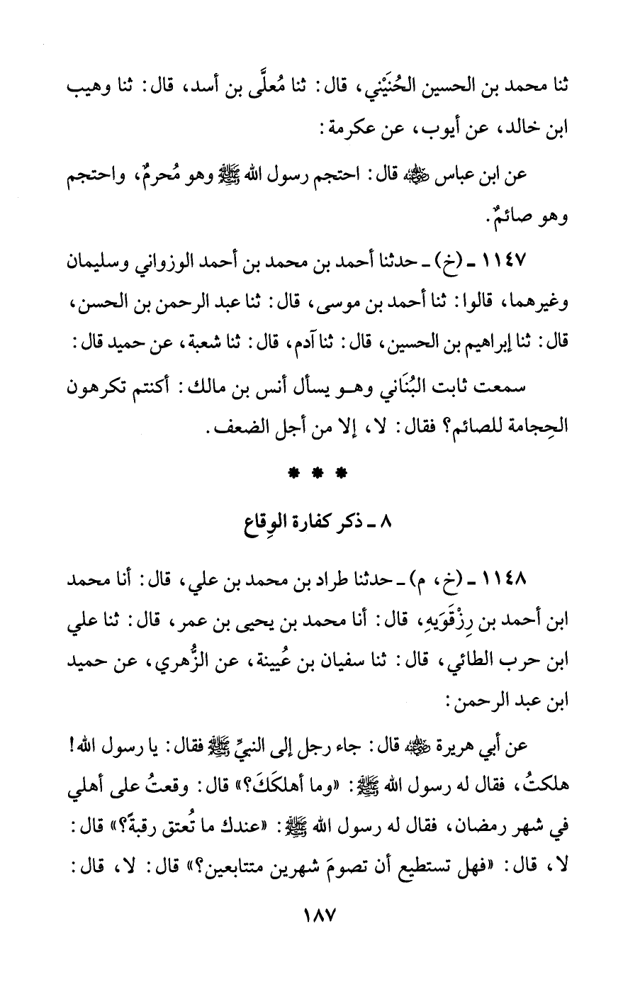 1147 - (خ) - حدثنا أحمد بن محمد بن أحمد الوزواني وسليمان وغيرهما، قالوا: ثنا أحمد بن موسى، قال: ثنا عبد الرحمن بن الحسن، قال: ثنا إبراهيم بن الحسين، قال: ثنا آدم، قال: ثنا شعبة، عن حميد قال: