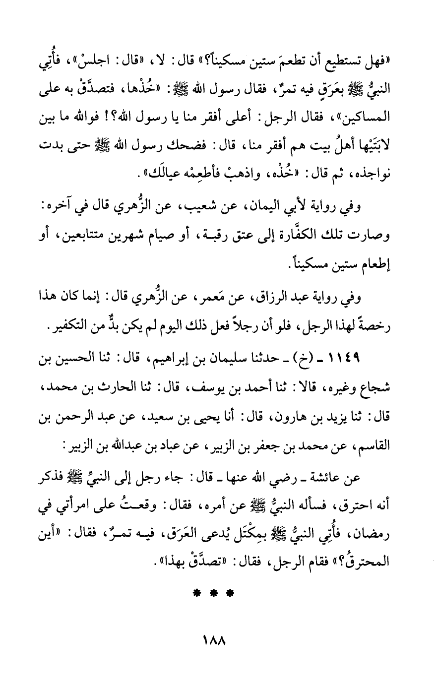 1149 - (خ) - حدثنا سليمان بن إبراهيم، قال: ثنا الحسين بن شجاع وغيره، قالا: ثنا أحمد بن يوسف، قال: ثنا الحارث بن محمد، قال: ثنا يزيد بن هارون، قال: أنا يحيى بن سعيد، عن عبد الرحمن بن القاسم، عن محمد بن جعفر بن الزبير، عن عباد بن عبد الله بن الزبير: