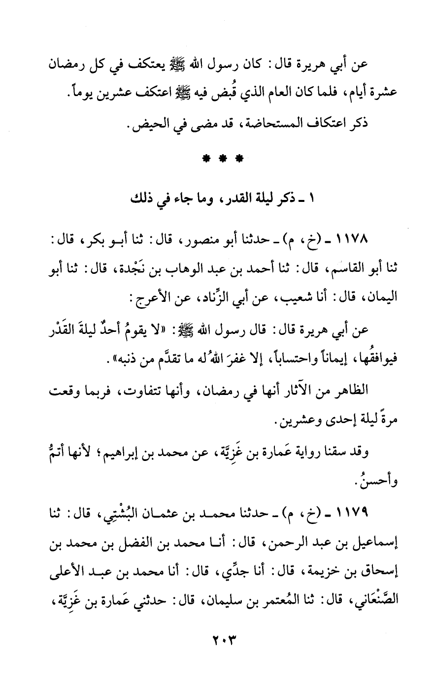 1179 - (خ، م) - حدثنا محمد بن عثمان البشتي، قال: ثنا إسماعيل بن عبد الرحمن، قال: أنا محمد بن الفضل بن محمد بن إسحاق بن خزيمة، قال: أنا جدي، قال: أنا محمد بن عبد الأعلى الصنعاني، قال: ثنا المعتمر بن سليمان، قال: حدثني عمارة بن غزية، #204# قال: سمعت محمد بن إبراهيم يحدث عن أبي سلمة: