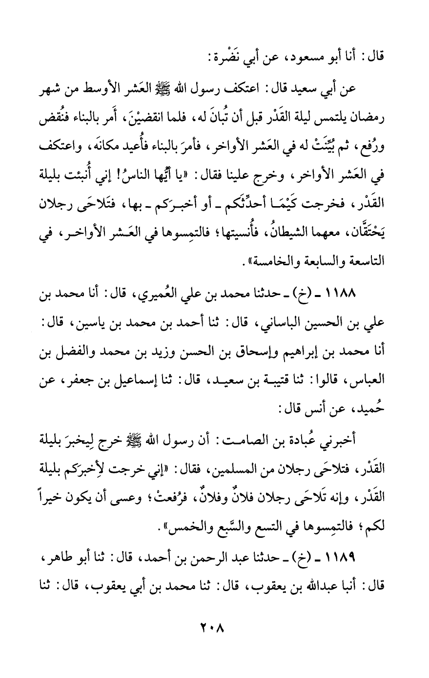 1188 - (خ) - حدثنا محمد بن علي العميري، قال: أنا محمد بن علي بن الحسين الباساني، قال: ثنا أحمد بن محمد بن ياسين، قال: أنا محمد بن إبراهيم وإسحاق بن الحسن وزيد بن محمد والفضل بن العباس، قالوا: ثنا قتيبة بن سعيد، قال: ثنا إسماعيل بن جعفر، عن حميد، عن أنس قال: