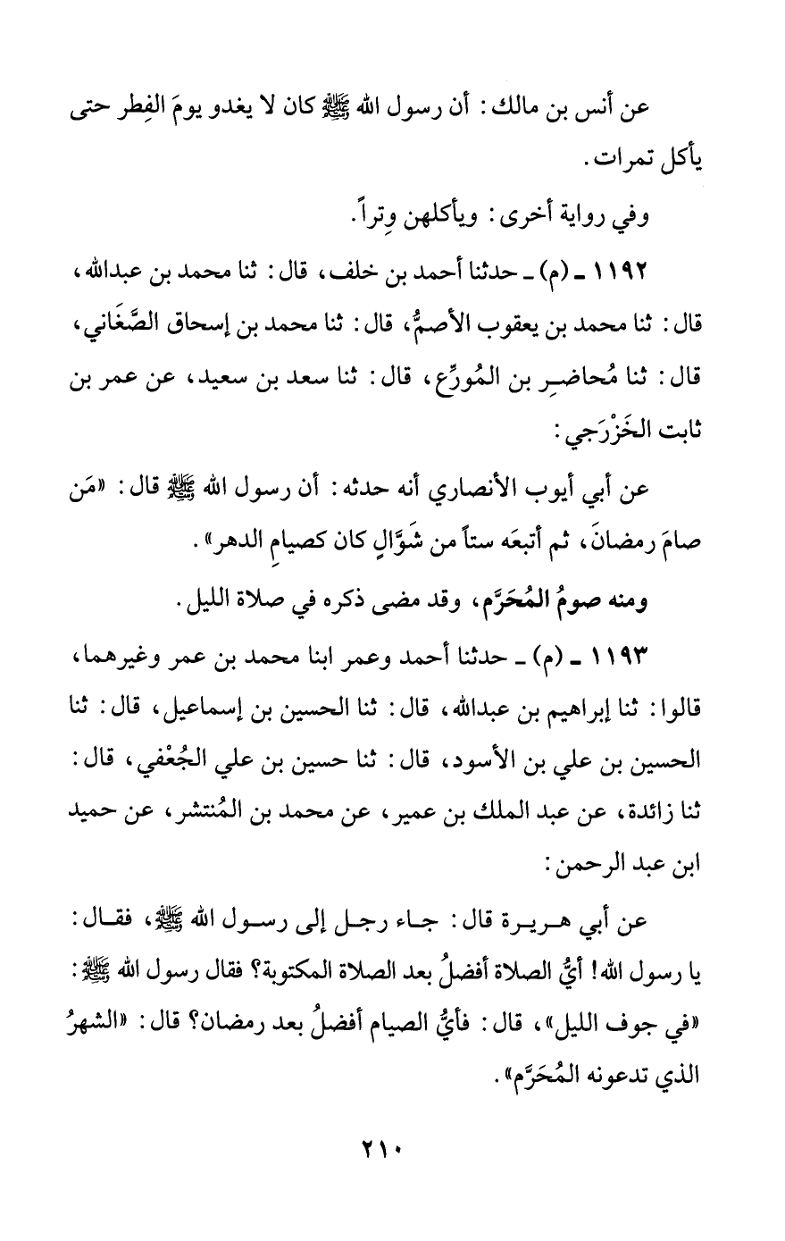 عن أبي هريرة قال: جاء رجل إلى رسول الله صلى الله عليه وسلم، فقال: يا رسول الله! أي الصلاة أفضل بعد الصلاة المكتوبة؟ فقال رسول الله صلى الله عليه وسلم: ((في جوف الليل))، قال: فأي الصيام أفضل بعد رمضان؟ قال: ((الشهر الذي تدعونه المحرم)).