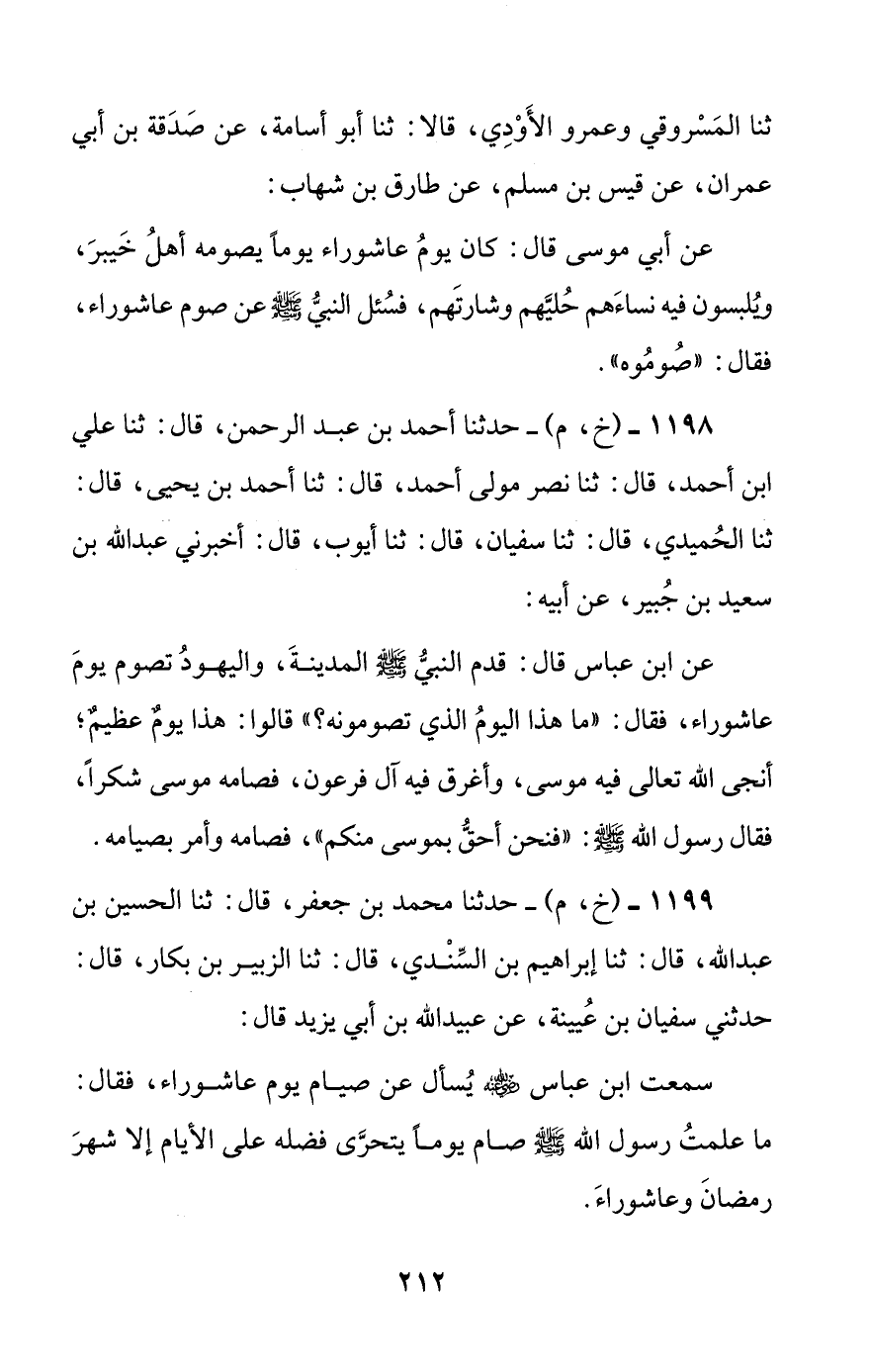 1198 - (خ، م) - حدثنا أحمد بن عبد الرحمن، قال: ثنا علي بن أحمد، قال: ثنا نصر مولى أحمد، قال: ثنا أحمد بن يحيى، قال: ثنا الحميدي، قال: ثنا سفيان، قال: ثنا أيوب، قال: أخبرني عبد الله بن سعيد بن جبير، عن أبيه: