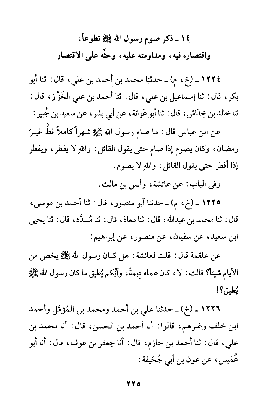 1225 - (خ، م) - حدثنا أبو منصور، قال: ثنا أحمد بن موسى، قال: ثنا محمد بن عبد الله، قال: ثنا معاذ، قال: ثنا مسدد، قال: ثنا يحيى بن سعيد، عن سفيان، عن منصور، عن إبراهيم: