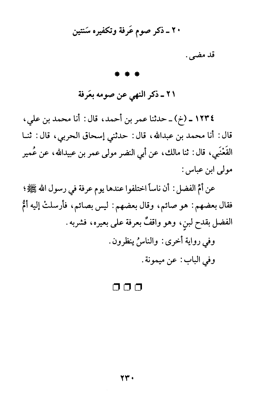 1234 - (خ) - حدثنا عمر بن أحمد، قال: أنا محمد بن علي، قال: أنا محمد بن عبد الله، قال: حدثني إسحاق الحربي، قال: ثنا القعنبي، قال: ثنا مالك، عن أبي النضر مولى عمر بن عبيد الله، عن عمير مولى ابن عباس: