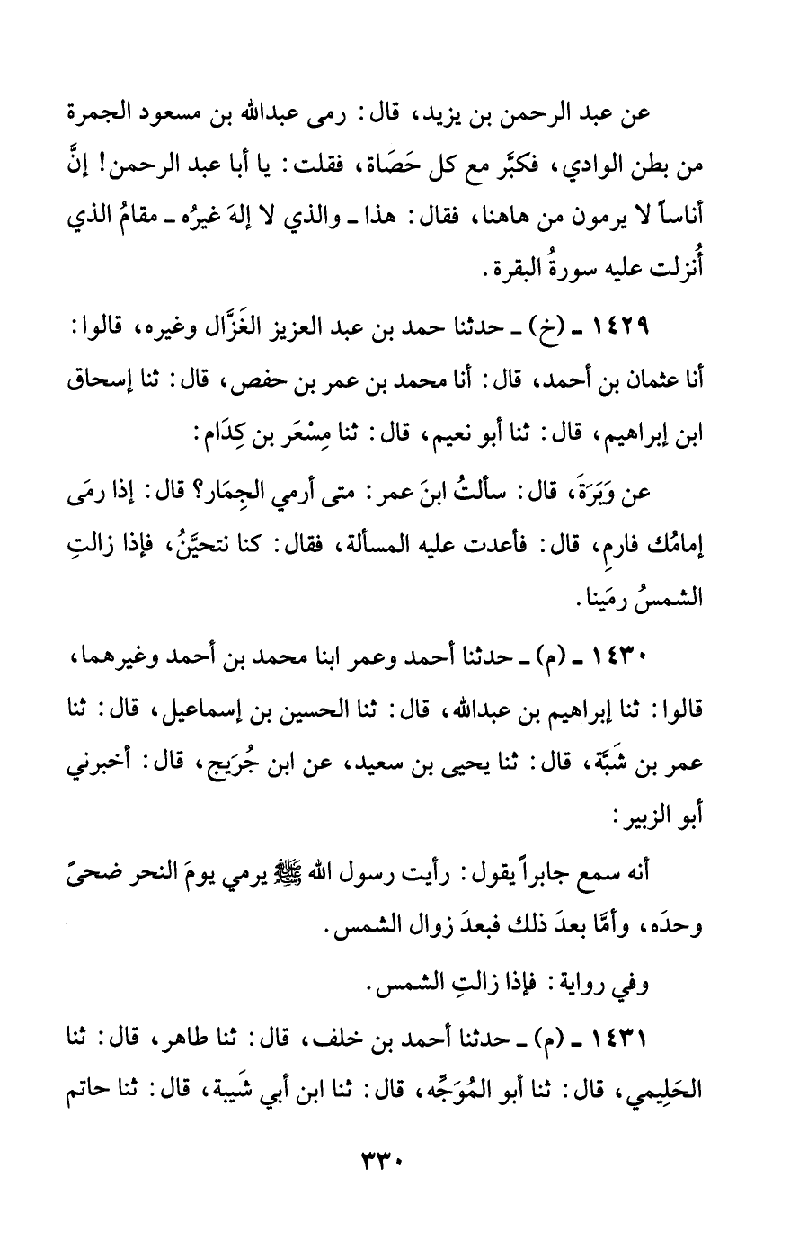 1430 - (م) - حدثنا أحمد وعمر ابنا محمد بن أحمد وغيرهما، قالوا: ثنا إبراهيم بن عبد الله، قال: ثنا الحسين بن إسماعيل، قال: ثنا عمر بن شبة، قال: ثنا يحيى بن سعيد، عن ابن جريج، قال: أخبرني أبو الزبير:
