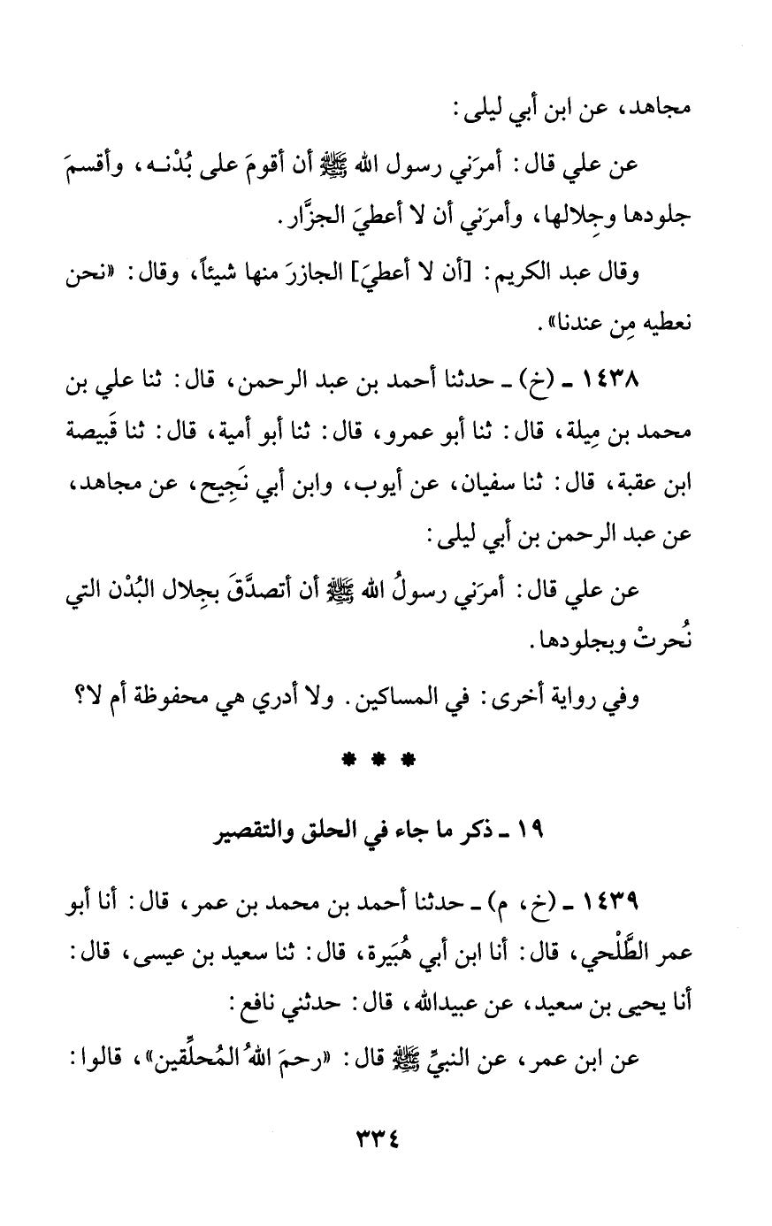 1438 - (خ) - حدثنا أحمد بن عبد الرحمن، قال: ثنا علي بن محمد بن ميلة، قال: ثنا أبو عمرو، قال: ثنا أبو أمية، قال: ثنا قبيصة ابن عقبة، قال: ثنا سفيان، عن أيوب، وابن أبي نجيح، عن مجاهد، عن عبد الرحمن بن أبي ليلى: