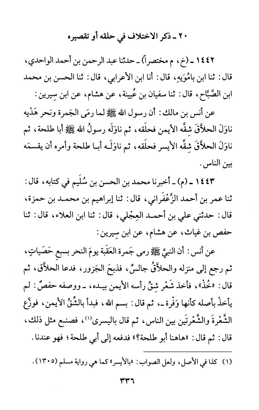 [20] ذكر الاختلاف في حلقه أو تقصيره