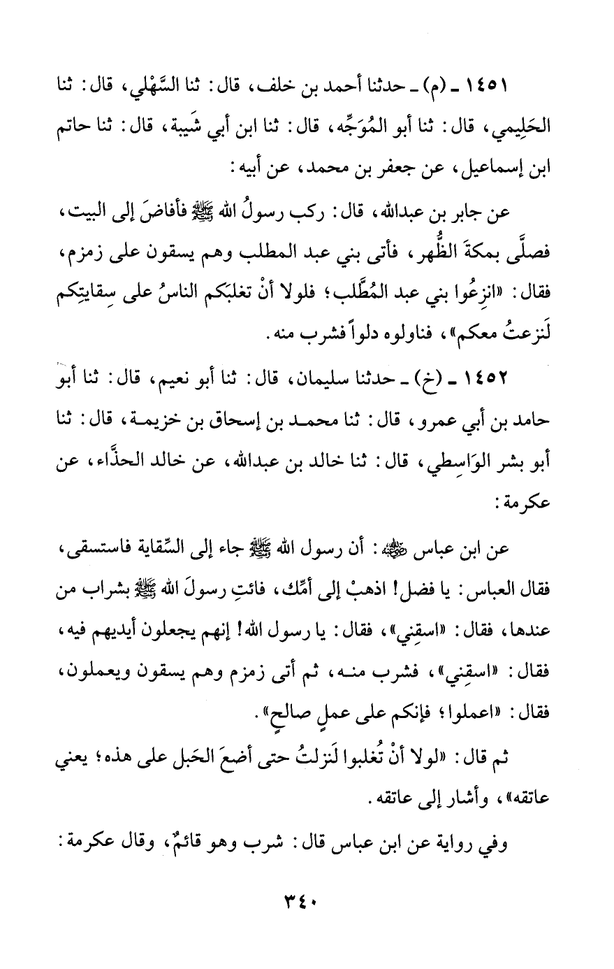عن جابر بن عبد الله، قال: ركب رسول الله صلى الله عليه وسلم فأفاض إلى البيت، فصلى بمكة الظهر، فأتى بني عبد المطلب وهم يسقون على زمزم، فقال: ((انزعوا بني عبد المطلب؛ فلولا أن تغلبكم الناس على سقايتكم لنزعت معكم))، فناولوه دلوا فشرب منه.