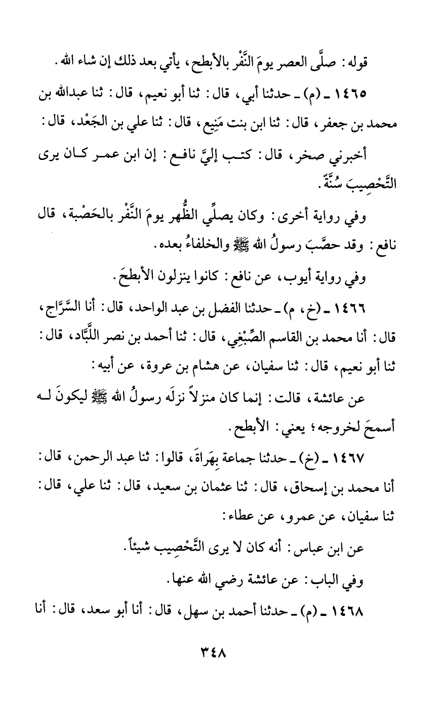وفي رواية أخرى: وكان يصلي الظهر يوم النفر بالحصبة، قال نافع: وقد حصب رسول الله صلى الله عليه وسلم والخلفاء بعده.