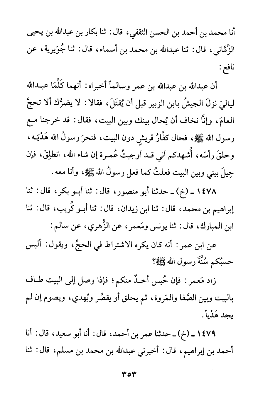 1478 - (خ) - حدثنا أبو منصور، قال: ثنا أبو بكر، قال: ثنا إبراهيم بن محمد، قال: ثنا ابن زيدان، قال: ثنا أبو كريب، قال: ثنا ابن المبارك، قال: ثنا يونس ومعمر، عن الزهري، عن سالم: