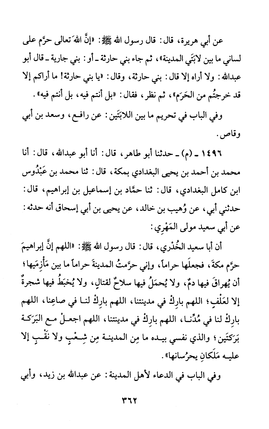 أن أبا سعيد الخدري قال: قال رسول الله صلى الله عليه وسلم: ((اللهم إن إبراهيم حرم مكة، فجعلها حراما، وإني حرمت المدينة حراما ما بين مأزميها؛ أن يهراق فيها دم، ولا يحمل فيها سلاح لقتال، ولا يخبط فيها شجرة إلا لعلف؛ اللهم بارك في مدينتنا، اللهم بارك لنا في صاعنا، اللهم بارك لنا في مدنا، اللهم بارك في مدينتنا، اللهم اجعل مع البركة بركتين؛ والذي نفسي بيده ما من المدينة من شعب ولا نقب إلا عليه ملكان يحرسانها)).