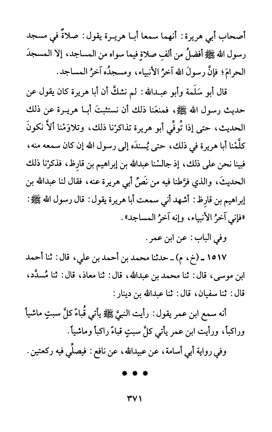 1517 - (خ، م) - حدثنا محمد بن أحمد بن علي، قال: ثنا أحمد بن موسى، قال: ثنا محمد بن عبد الله، قال: ثنا معاذ، قال: ثنا مسدد، قال: ثنا سفيان، قال: ثنا عبد الله بن دينار: