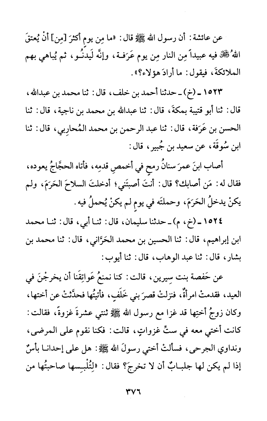عن حفصة بنت سيرين، قالت: كنا نمنع عواتقنا أن يخرجن في العيد، فقدمت امرأة، فنزلت قصر بني خلف، فأتيتها فحدثت عن أختها، وكان زوج أختها قد غزا مع رسول الله صلى الله عليه وسلم ثنتي عشرة غزوة، فقالت: كانت أختي معه في ست غزوات، قالت: فكنا نقوم على المرضى، ونداوي الجرحى، فسألت أختي رسول الله صلى الله عليه وسلم: هل على إحدانا بأس إذا لم يكن لها جلباب أن لا تخرج؟ فقال: ((لتلبسها صاحبتها من #377# جلبابها، فتشهد الخير ودعوة المؤمنين))، قالت حفصة: فقدمت أم عطية، فسألتها: هل سمعت من رسول الله صلى الله عليه وسلم كذا وكذا؟ فقالت: نعم، بأبي –وكانت لا تذكر رسول الله صلى الله عليه وسلم إلا قالت: بأبي- سمعته يقول: ((ليخرج العواتق وذوات الخدور والحيض، ويعتزل الحيض المصلى، فيشهدن الخير ودعوة المؤمنين))، قالت: فقلت لها: الحيض؟! قالت: نعم؛ أوليس الحائض تشهد عرفة، وتشهد كذا، وتشهد كذا.