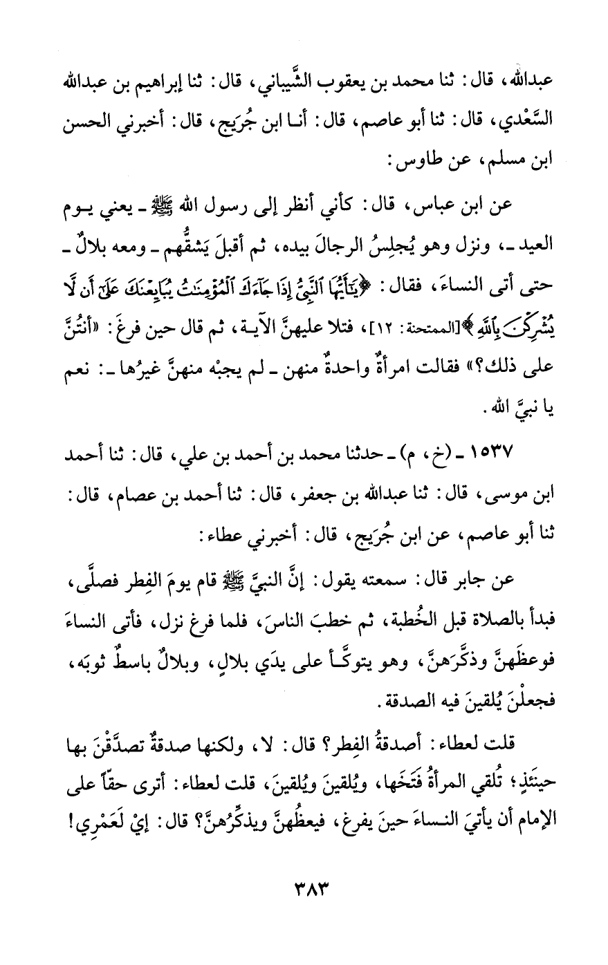 1537 - (خ، م) - حدثنا محمد بن أحمد بن علي، قال: ثنا أحمد بن موسى، قال: ثنا عبد الله بن جعفر، قال: ثنا أحمد بن عصام، قال: ثنا أبو عاصم، عن ابن جريج، قال: أخبرني عطاء: