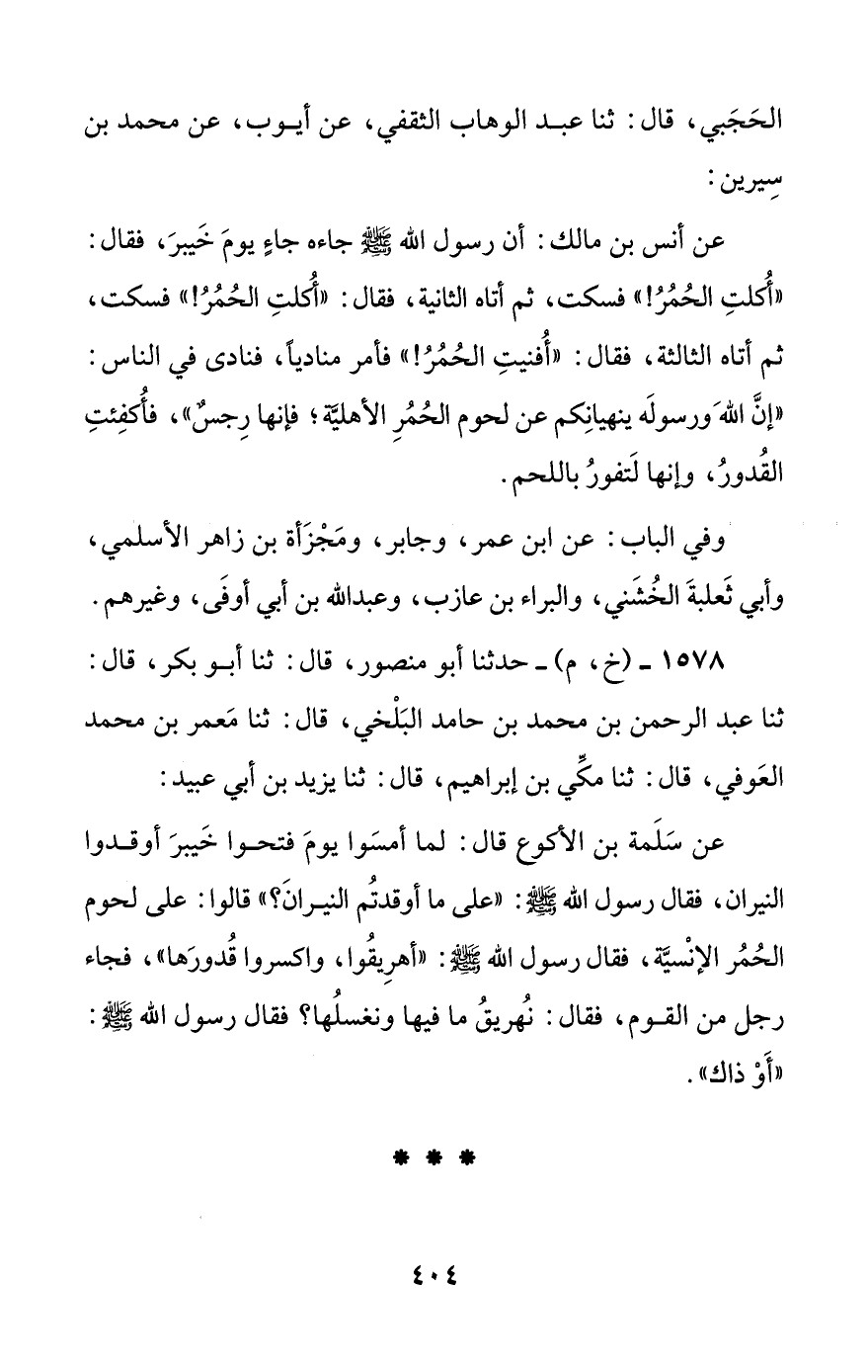 عن سلمة بن الأكوع قال: لما أمسوا يوم فتحوا خيبر أوقدوا النيران، فقال رسول الله صلى الله عليه وسلم: ((على ما أوقدتم النيران؟)) قالوا: على لحوم الحمر الإنسية، فقال رسول الله صلى الله عليه وسلم: ((أهريقوا، واكسروا قدورها))، فجاء رجل من القوم، فقال: نهريق ما فيها ونغسلها؟ فقال رسول الله صلى الله عليه وسلم ((أو ذاك)).